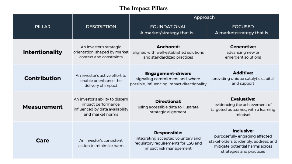 What we are proposing here is to reaffirm the primacy of the three core pillars and, with pragmatism, ambition and clarity, work together to recast the market’s boundaries. Moreover, we are recommending the addition of “care” as a long overdue fourth pillar, grounded in established risk management practices, the growing body of regulations aimed at codifying impact investing, and most importantly, the normative value of do no harm.